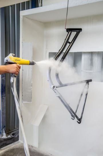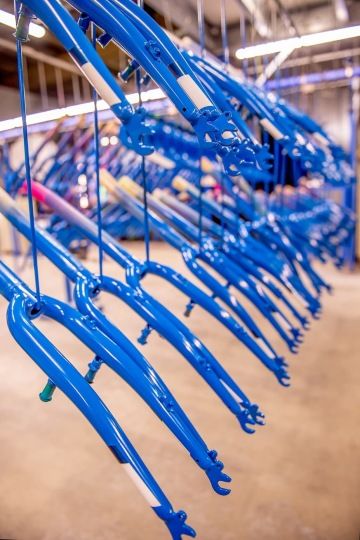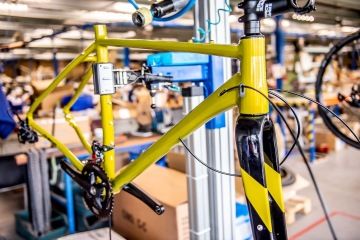 High-quality painting of bicycle frames represents an important part of our production. Our employees do all the paint work in our very own paint shop. Nine specialized employees can paint up to 900 bicycle components in one shift. The paint protects all the components while giving it its overall visual effect.